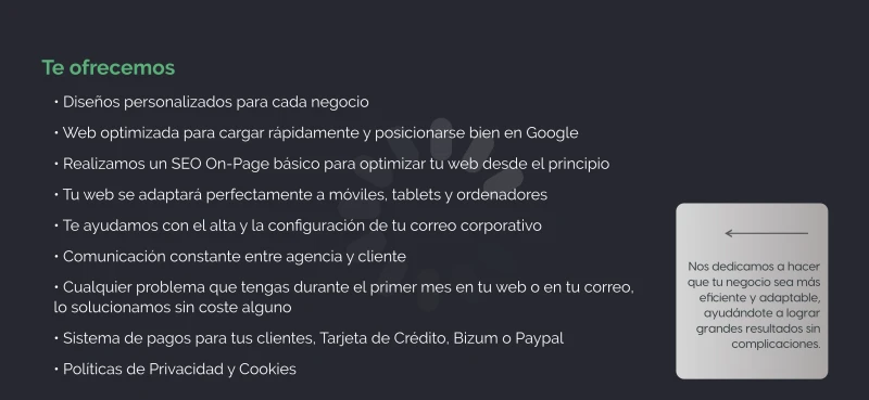 Con una web estructurada de forma profesional, tus clientes pueden acceder en segundos a toda la información que necesitan para decidir si visitarte o hacer un pedido. Por ejemplo: